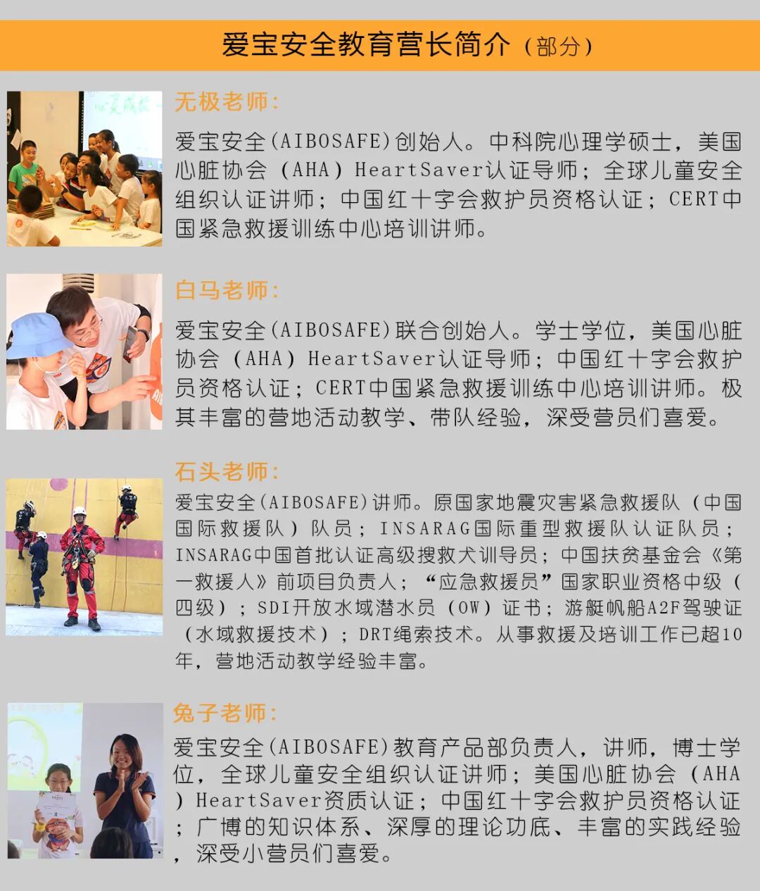 带队老师来自爱宝安全学院认证讲师,均具有丰富的营地活动经验。同时具有全球儿童安全组织认证讲师、中国红十字会救护员资格认证、美国心脏协会(AHA)基础生命支持国际资质认证。除专业营地指导员外如皮划艇、攀岩等运动项目还配有毕业于北京体育大学、天津体育学院的专业运动教练员。