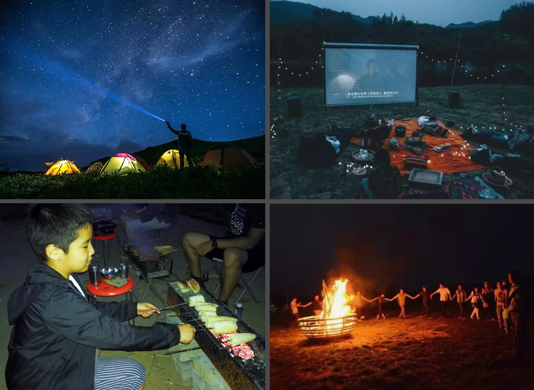 傍晚欢乐时间不能停,体验户外露天电影,荧光晚会各显才艺,在漫天繁星的陪伴下入眠,与大自然最亲近接触。