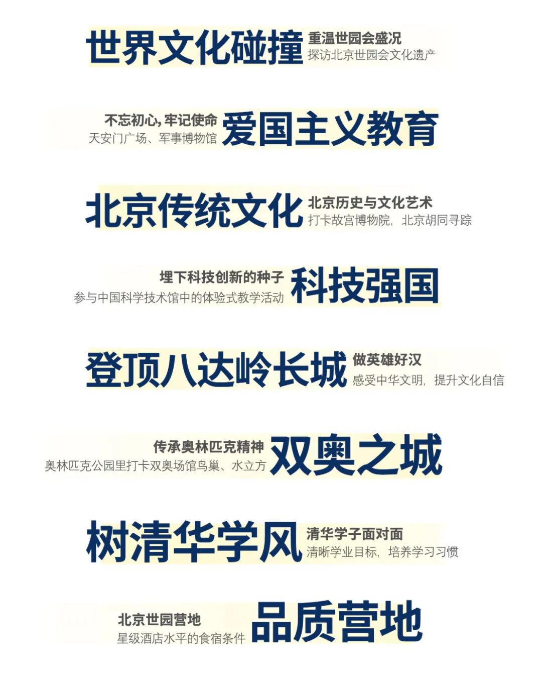 孩子们也将身临其境游学清华大学,充分感悟中国最高学府的博大精深和百年学府的独特魅力。在这里,和清华学子一起开启孩子内心的大学梦,从此埋下远大理想的种子。