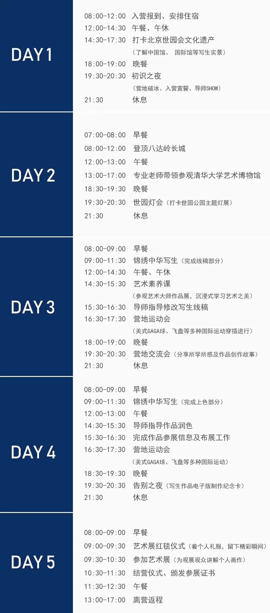 一站写生全中国:营员们将以小组为单位在专业老师的带领下深度游览、写生中国各地的知名景观建筑和园林艺术。通过对细节的观察和小组内部的思维碰撞,培养青少年具有发现、感知、欣赏、评价美的意识和基本能力。加深孩子们对于自然的认知,对于艺术的思考,激发创作愿望,提高创作能力。