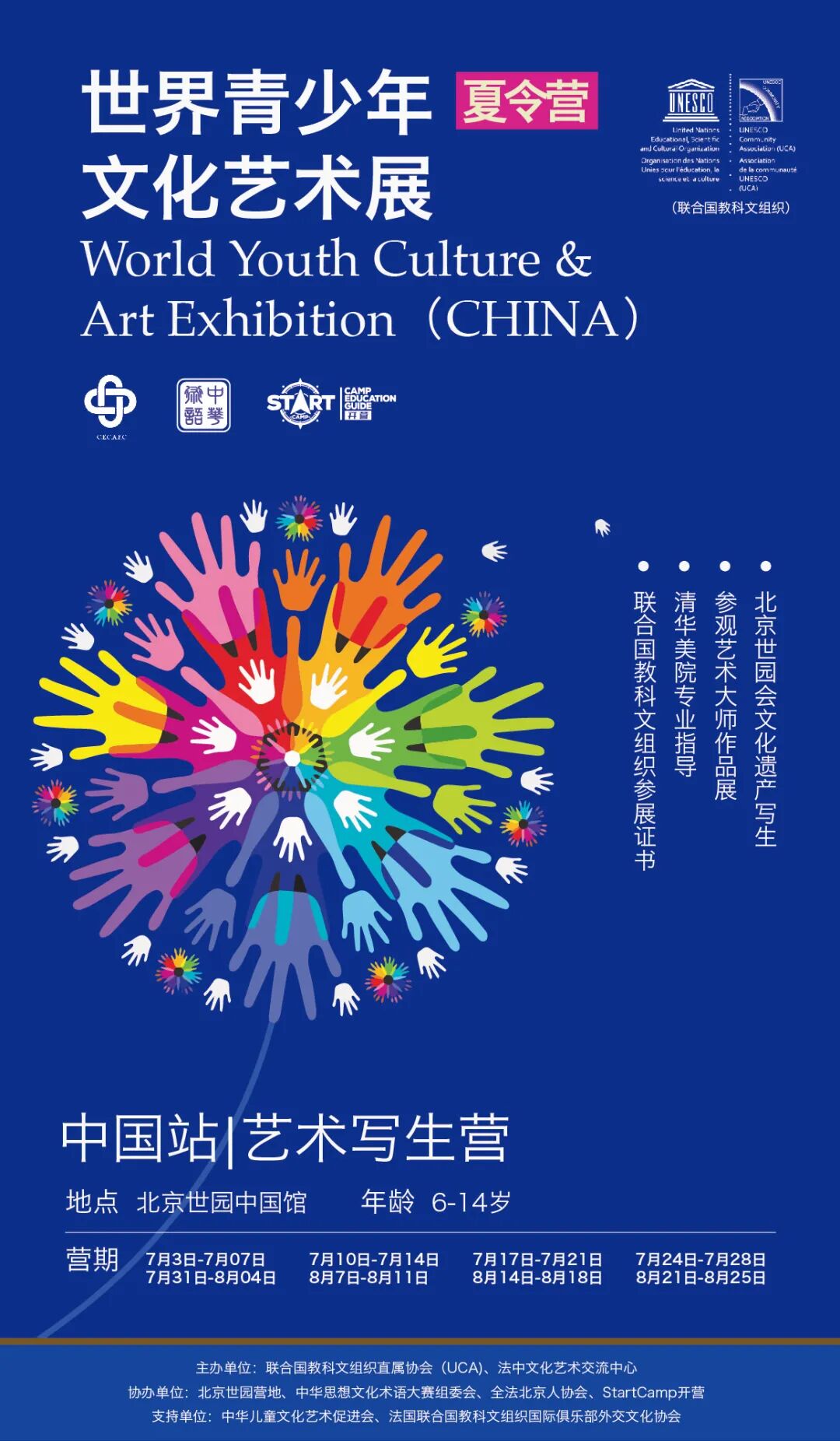由联合国教科文组织直属协会(UCA)、法中文化艺术交流中心主办,北京世园营地、“中华思想文化术语大赛”组委会、全法北京人协会、北纬开营协办,法国联合国教科文组织国际俱乐部外交文化协会、 中华儿童文化艺术促进会支持的“世界青少年文化艺术展-中国站”将于2023年6月在北京世园公园中国馆正式亮相。