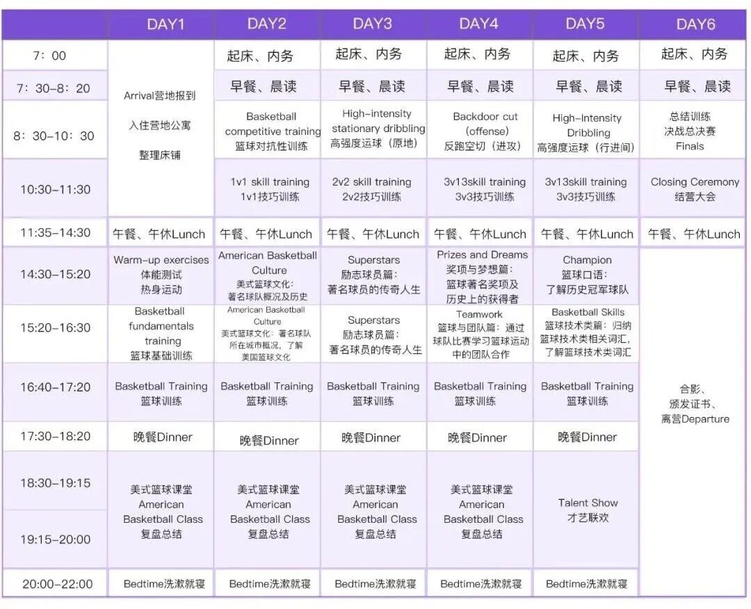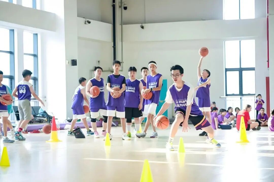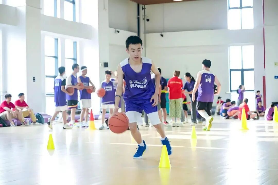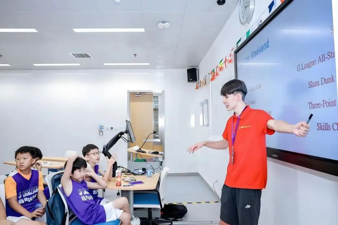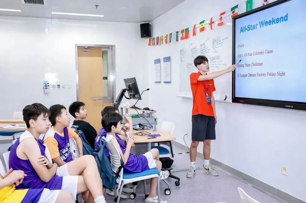 全英文环境是我们篮球营的核心亮点。从踏入营地的那一刻起,孩子们便置身于英语的海洋。无论是篮球场上教练的指令,如 “Dribble faster!(快点运球!)”“Pass the ball!(传球!)”,还是晚上课堂上的交流互动,都只用英语进行。这种沉浸式的体验,让孩子们无需刻意学习语法,就能在实际场景中自然掌握篮球英语,培养英语思维,就像身处美国篮球训练营一般真实!