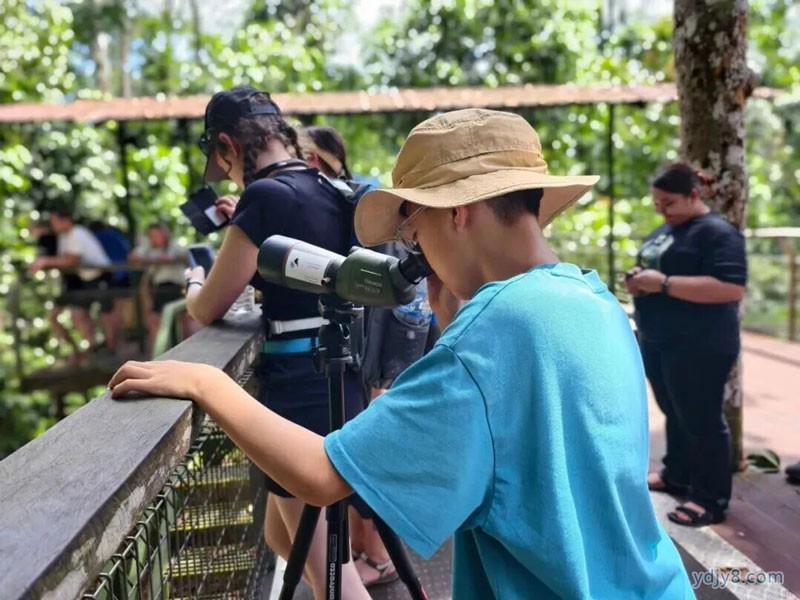在西必洛热带雨林探索中心,跟随老师前往雨林栈道,学习如何用专业观察技巧在林冠层间寻找珍稀鸟类,如犀鸟、山椒鸟和华氏鹰雕。