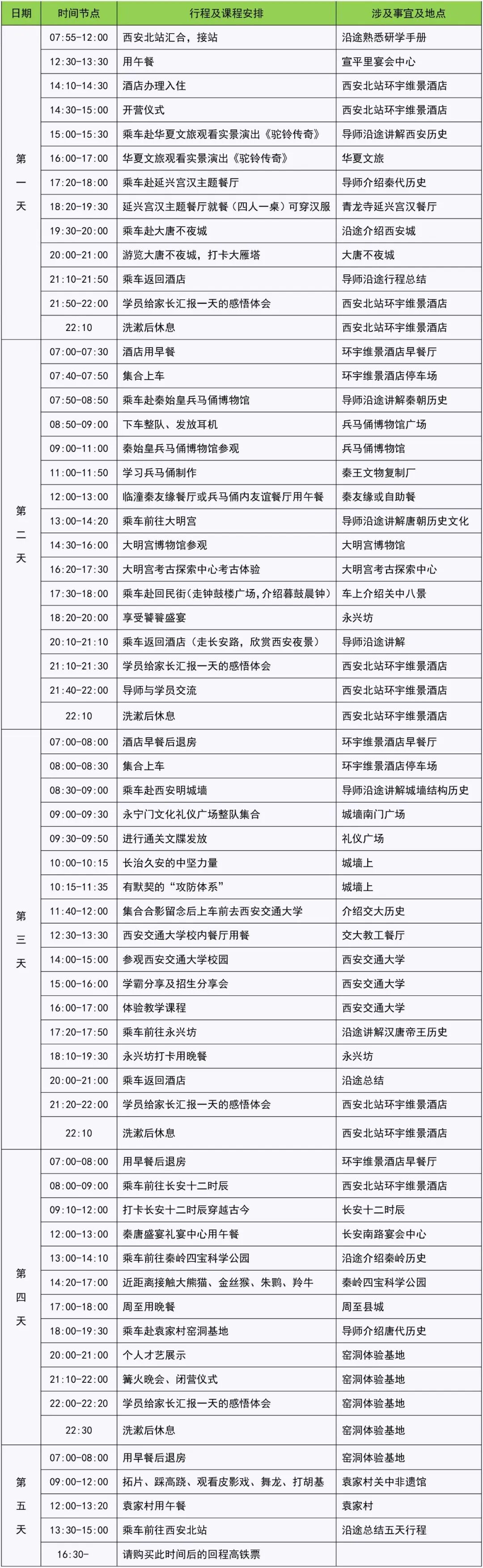 14:00-17:00 参观【西安交通大学】,感受名校学习氛围,树立大学梦想目标。蔡锷、黄炎培、茅以升、钱学森、江泽民,这一个个伟人的足迹将带你感受西安交通大学的人文底蕴与历史革新,并了解它的前世传奇。充分激发每个营员的“大学梦”!