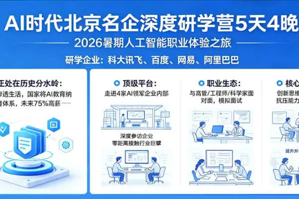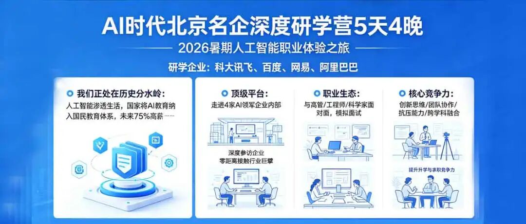 2026暑期,我们将开启一场深入中国科技心脏的“人工智能职业体验之旅”,走进中国当下的AI巨擎,触摸人工智能时代脉搏,规划未来核心竞争力。